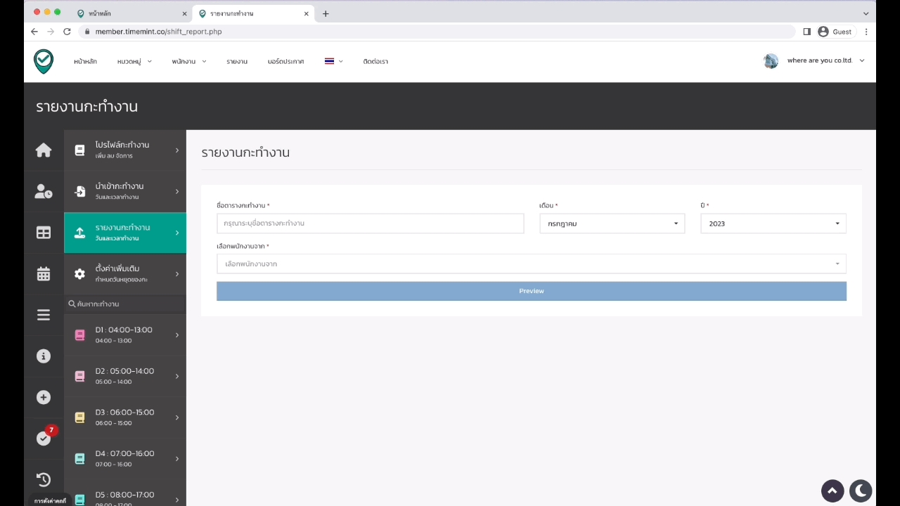 ระบุเรียบร้อยแล้วกด “Preview” ระบบจะแสดงตัวอย่างรายงานกะการทำงาน