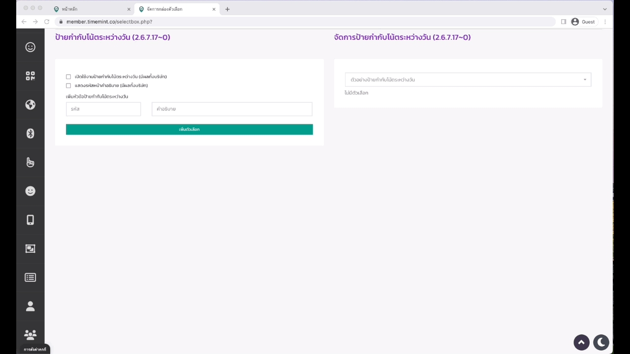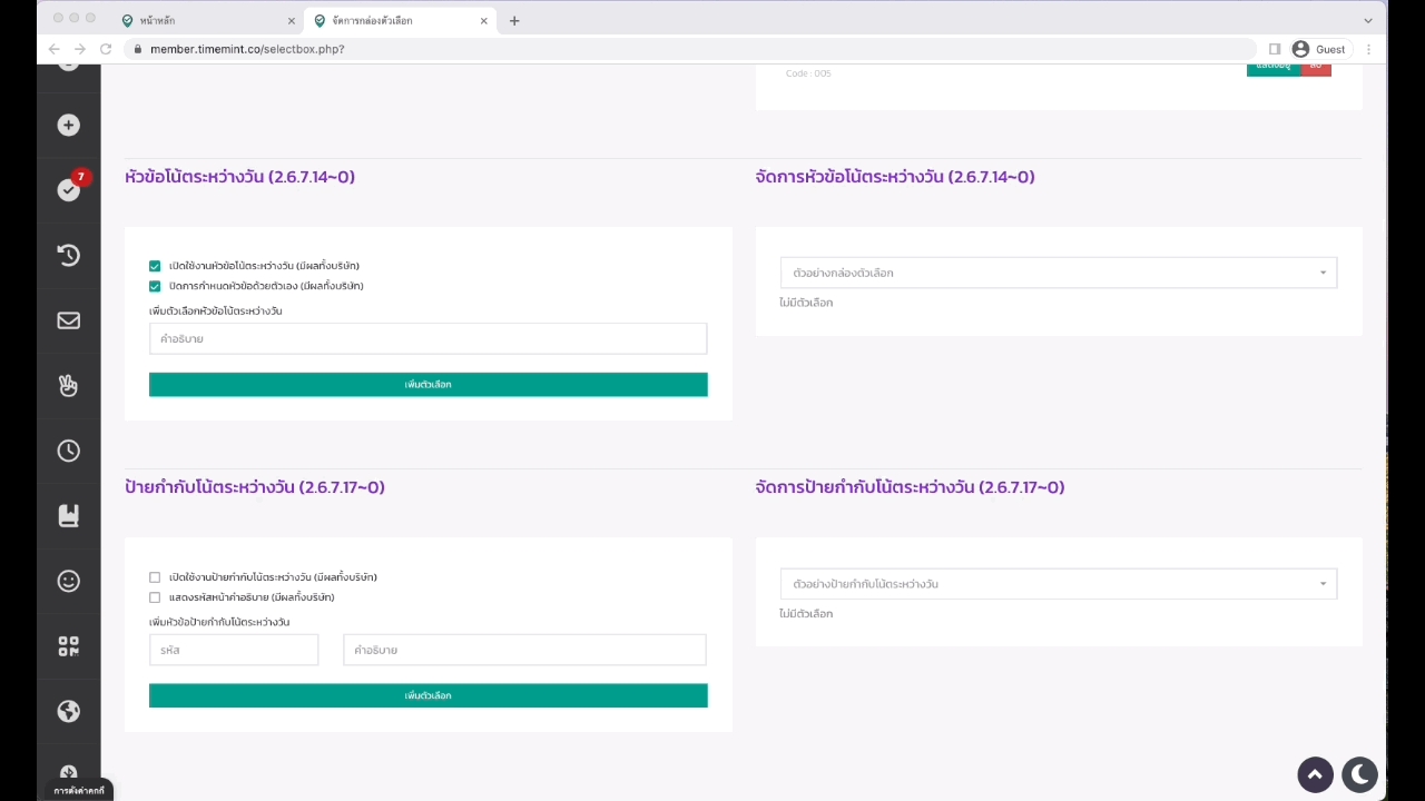1.เลือกเปิดฟังก์ชัน - เปิดใช้งานป้ายกำกับโน๊ตระหว่างวัน (มีผลทั้งบริษัท) - เเสดงรหัสหน้าคำอธิบาย (มีผลทั้งบริษัท) 2.ระบุ "เพิ่มหัวข้อป้ายกำกับโน๊ตระหว่างวัน" 3. ใส่คำอธิบาย 4. เลือก "เพิ่มตัวเลือก"